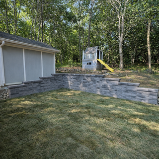 A custom retaining wall installation in Dartmouth constructed using Shaw Brick’s Pisa Edge system. This project was designed to transform previously sloped, underutilized yard space into a safe, level area for the homeowners’ children to enjoy. The clean stepped layout maximizes usable square footage while maintaining structural integrity and proper grade retention.